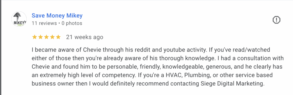 If you’re a HVAC, Plumbing, or other service based business owner then I would definitely recommend contacting Siege Digital Marketing.